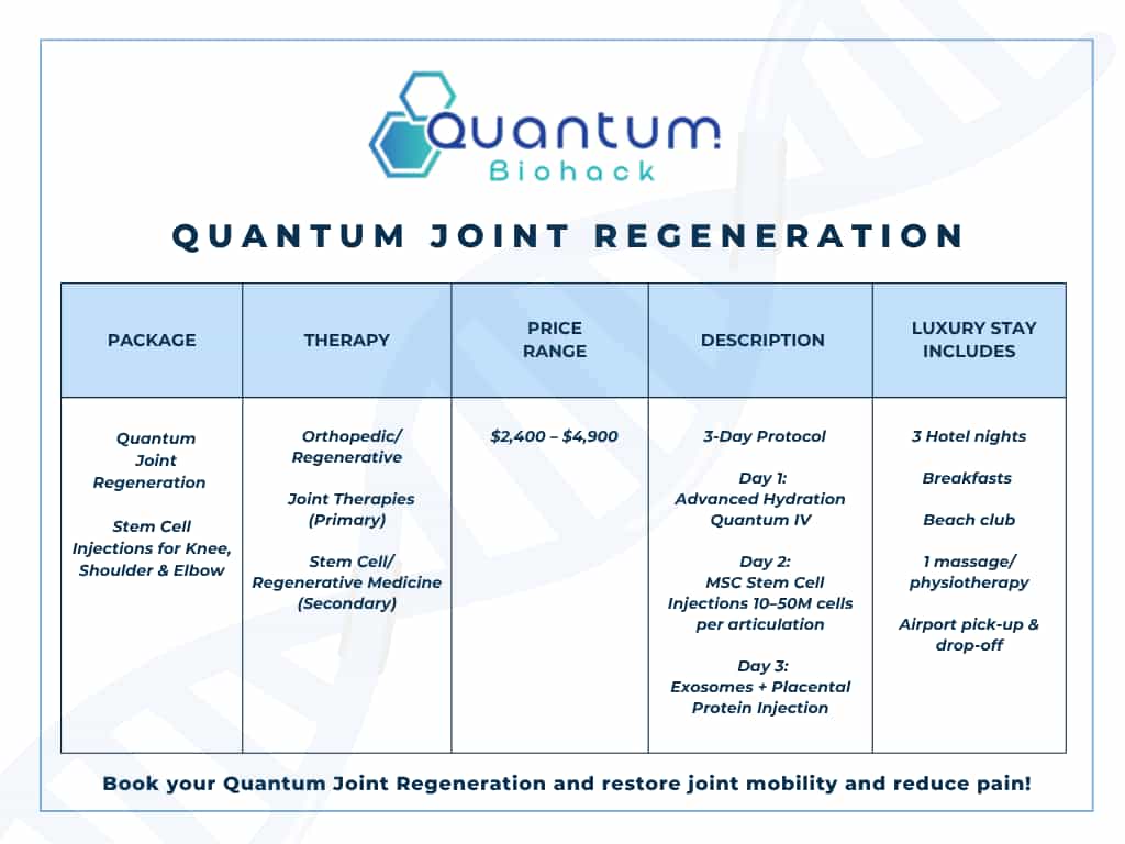 Discover advanced regenerative care with our Knee Stem Cell Therapy Package at Quantum Biohack Playa del Carmen, Mexico. This specialized treatment is designed for individuals seeking support for knee pain, inflammation, stiffness, and reduced mobility through MSC intra-articular injections delivered directly into the affected joint. At Quantum Biohack, we combine personalized care, advanced protocols, and modern facilities to create a professional and comfortable treatment experience focused on helping patients improve joint function and overall quality of life. As part of this 2026 Special available from May through October, patients also receive 3 free nights, making it easier to enjoy both treatment and recovery in the relaxing setting of Playa del Carmen, Mexico.
