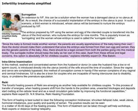 Infertility Treatments Infertility Treatments Simplified The times Of India, 26 march 2012 "Since the baby is formed inside another woman, the parents are usually apprehensive of 'the baby being their own'. Here the doctor should make them understand that since the embryo was formed from their own egg and semen, they are the genetic parents of the baby. Also, there should be a legal consent from both the parties going into this medical treaty. The surrogate mother should keep the baby as her own in this case. Apart from these ethical and legal concerns, this option is absolutely OK for childless couples," explains Infertility expert Dr. Rita Bakshi.