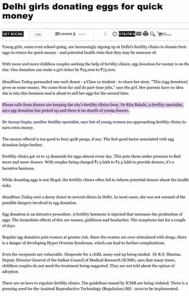Delhi Girls Donating Eggs Delhi girls donating eggs for quick money India Today, 11 August, 2010 Phone calls from donors are keeping the city's fertility clinics busy. Dr Rita Bakshi, a fertility specialist, says egg donation has picked up and there is no dearth of young donors.