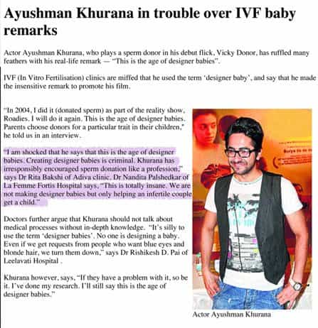 IVF Baby Ayushman Khurana in trouble over ivf baby remarks Hindustan Times, 23 march 2012 I am shocked that he says that this is the age of designer babies. Creating designer babies is criminal. Khurana has irresponsibly encouraged sperm donation like a profession,” says Dr Rita Bakshi of Adiva clinic.