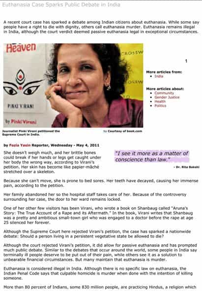 Euthanasia Case India Euthanasia Case Sparks Public Debate in India Global Press Institute, 26 march 2012 "I see it more as a matter of conscience than law." - Dr. Rita Bakshi