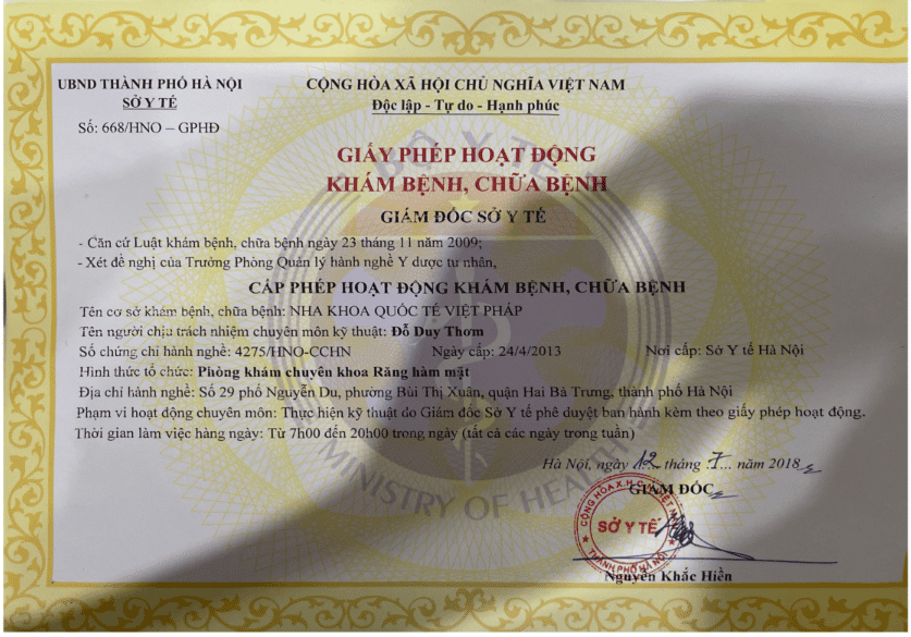 Viet Phap International Dental Clinic operates under an ISO-standard quality management system for hygiene, sterilization, and patient safety, proudly being the first dental clinic system in Vietnam to achieve ISO 9001:2008 certification. The clinic has also been awarded the Vietnam Gold Star Award for cosmetic dental services, the Top 50 Perfect Quality Services Certification (2019), and the International Quality Certification Gold Medal (2018) by the Southeast Asian Research Association. Thanks to a flawless clinical environment and high success rates, the clinic is the "Official Strategic Partner" of global dental corporations such as Straumann, Nobel Biocare, Osstem Implant, and Dentsply.